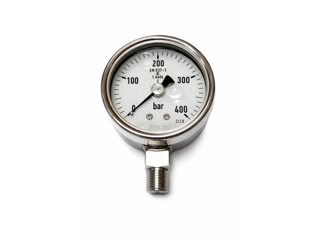celonerezový manometr 63mm, 0/400bar 1/4NPT spodní přip., silikon, S2, bez loga
